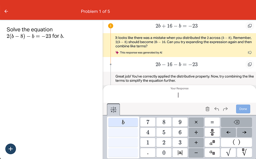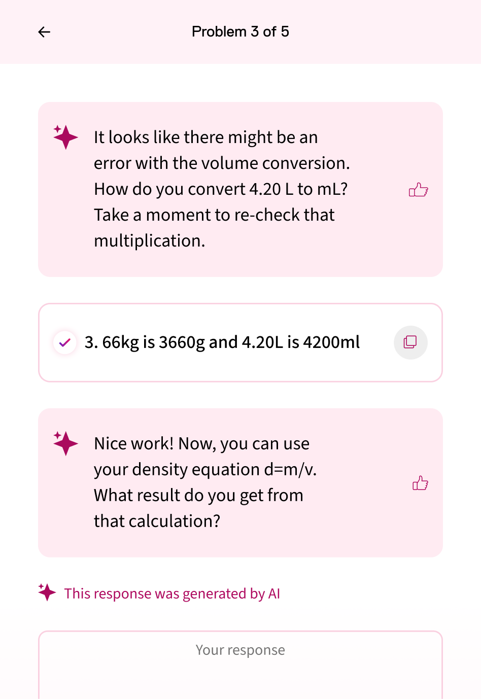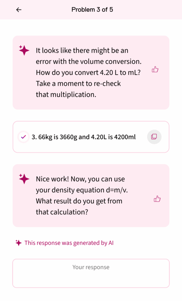 Think AI can’t give accurate math feedback? Think again. Aktiv’s proprietary computer algebra system checks if a student’s math is correct before Ace even gets involved, resulting in specific—and accurate—feedback for math and numeric chemistry problems.